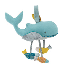 Cette jolie baleine d'activités à l'effigie de Joséphine, la baleine bienveillante de la collection Le voyage d'Olga par Moulin Roty, divertira votre petit bout avec douceur. Il lui apprendra de nouveaux sons grâce aux petits poissons, émettant un bruit de billes lorsqu'on les secoue. Bébé s'amusera aussi à apprivoiser son reflet grâce au petit miroir caché sous la nageoire de Joséphine. Il s'amusera également avec le papier crissant dans les plumes situées sur la tête de la baleine ou encore le "pouët pouët" lorsque l'on pince son dos. Grâce à son attache, Joséphine peut être emportée partout : sur la poussette, dans le parc,...