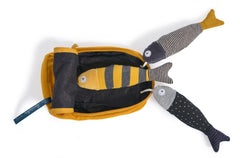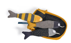 Ce jouet d'activités s'ouvre comme une boîte à sardine pour révéler 3 poissons aux couleurs de la collection. Ces sardines sont faciles à saisir par bébé et chacune lui réserve une surprise. La sardine à rayures jaunes fait un bruit de hochet, celle à fines rayures a du papier crissant et celle à pois fait pouêt-pouêt. Le tout se referme à l'aide d'une fermeture éclair, ce jouet d'éveil est facile à transporter et prend peu de place. Idée de cadeau originale pour un nouveau-né.