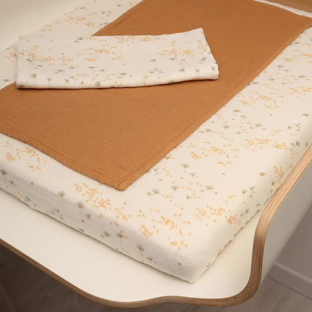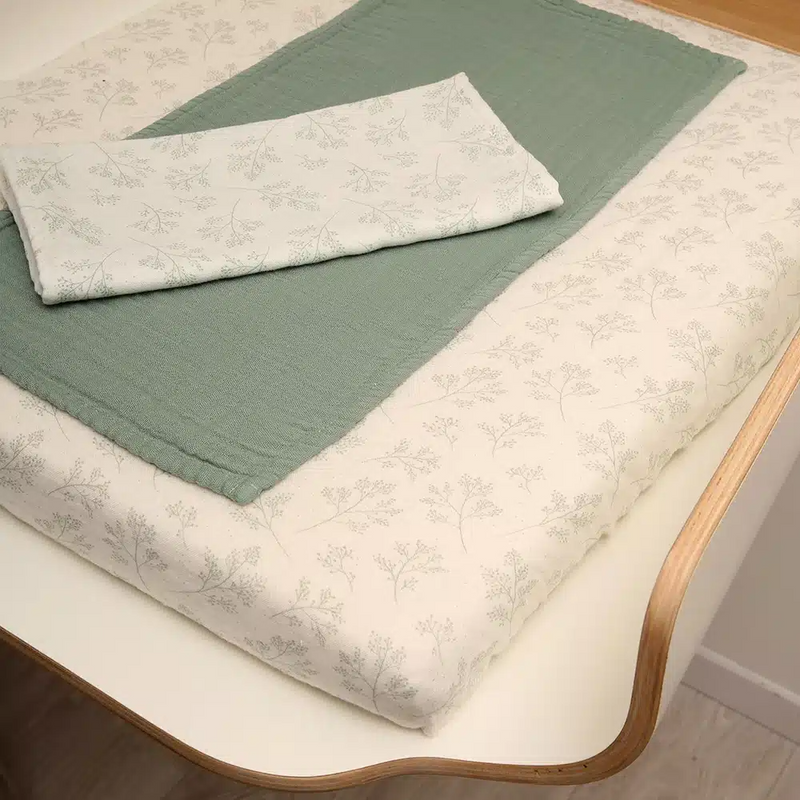 Cette housse pour matelas à langer NOGA et ses deux langes en coton biologique, certifiés GOTS, doux et confortables, apporteront une petite touche déco au coin change de bébé.