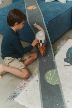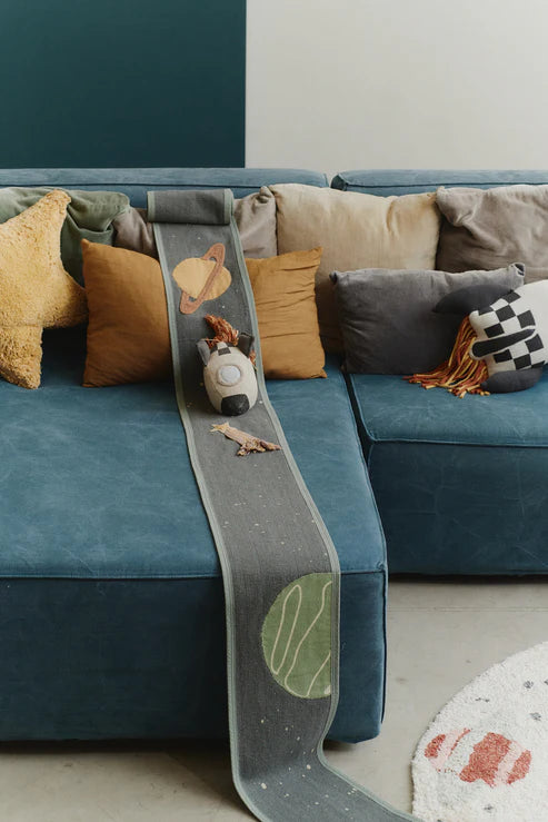 Déroulez sa toile de 4 mètres avec des détails touffus qui évoquent des éléments de l'espace tels que des vaisseaux spatiaux et des étoiles filantes dans différentes couleurs et textures.