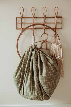 Notre nouvelle impression Grid Green ajoutera une belle touche à n'importe quel espace. Ce qui est génial, car notre sac Play&Go est fait pour être transporté d'une pièce à l'autre. Un rangement pour jouets qui a fière allure, n'importe où.